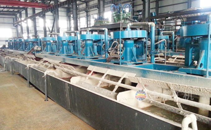 本工藝采用兩段一閉路破碎流程,合格產品進入粉礦倉緩存,礦石由擺式給礦機均勻的給到直筒節能格子型球磨機進行磨礦,格子球磨機和高堰式單螺旋分級組成一段閉路磨礦分級流程。球磨機的排礦先經過跳汰機富集大顆粒金,跳汰機底流通過兩段搖床選出30%品位的顆粒金,跳汰機的溢流進入分級機。分級溢流經過攪拌槽的調漿后進入浮選系統,通過做礦石的可選性實驗研究我們選擇一粗三精三掃的浮選流程,從而很大程度的回收脈石中的有價金元素。浮選金精礦通過濃密機濃縮由過濾機完成脫水作業,浮選尾礦由濃密機濃縮后進入壓濾機進行壓濾成濾餅做到尾礦干排。金礦重浮聯合流程也是金鵬集團用于山東黃金集團蓬萊大柳行選廠項目中的成功經驗。