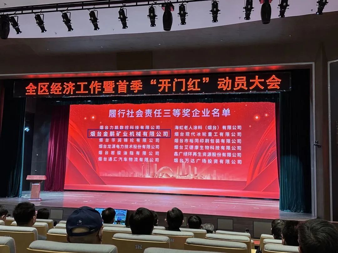 1月29日上午,煙臺(tái)黃渤海新區(qū)全區(qū)經(jīng)濟(jì)工作暨首季“開門紅”動(dòng)員大會(huì)在美麗的八角灣會(huì)展中心隆重舉行。會(huì)上,金鵬礦機(jī)被評為“履行社會(huì)責(zé)任三等獎(jiǎng)企業(yè)”,許慶硯總經(jīng)理獲頒“2022年度履行社會(huì)責(zé)任優(yōu)秀企業(yè)家”榮譽(yù)稱號(hào)。