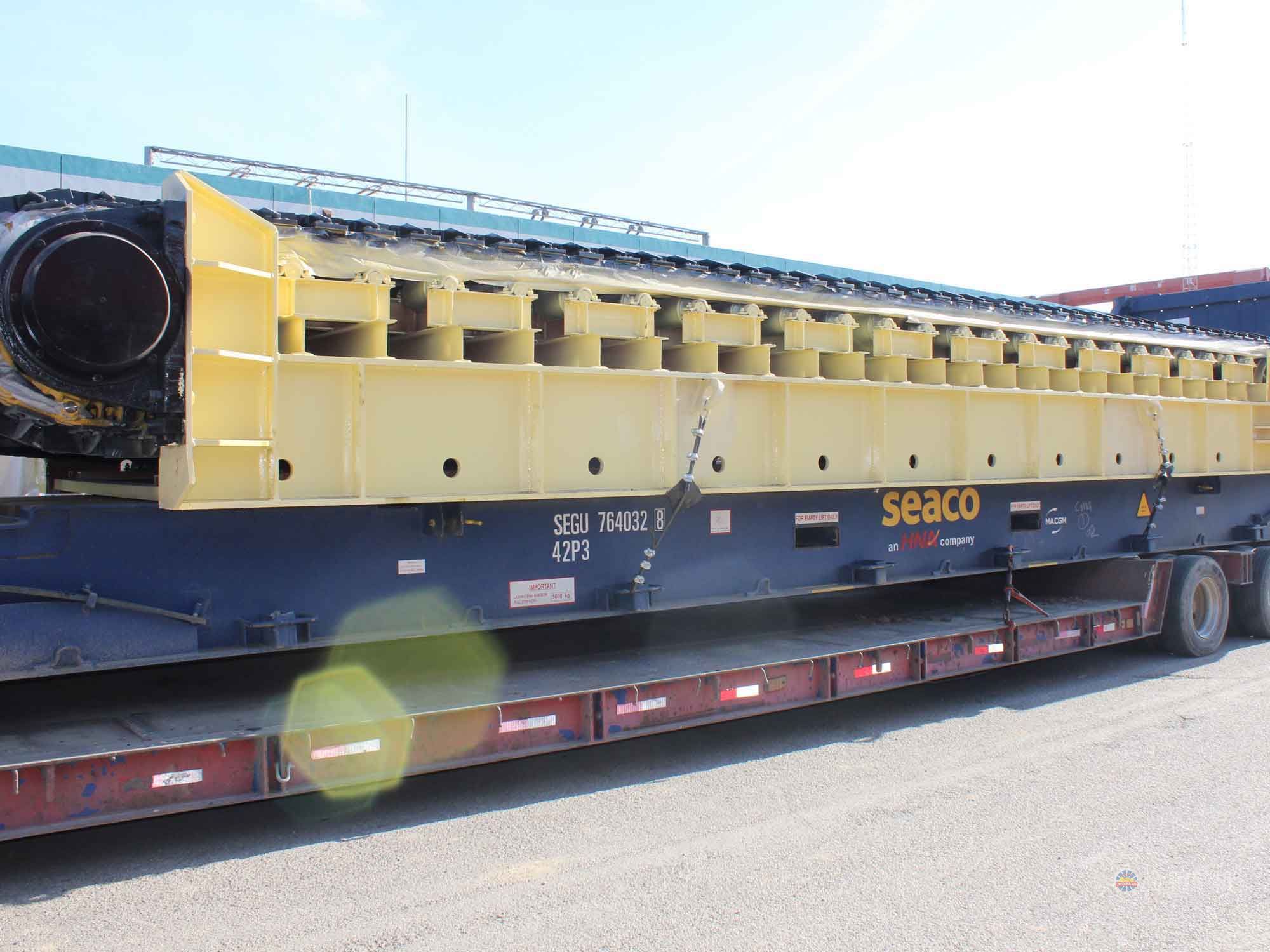 采用節(jié)距為200mm的高強(qiáng)度模鍛鏈條為牽引件,兩根鏈條繞過安裝在機(jī)體頭部的一對(duì)驅(qū)動(dòng)鏈輪和機(jī)體尾部的一對(duì)張緊輪聯(lián)成封閉形回路,在兩排鏈條的每個(gè)鏈節(jié)上裝配了相互交迭的、重型結(jié)構(gòu)的輸送槽而成為一個(gè)連續(xù)的能夠運(yùn)載物料的輸送線路。其自重和物料的重量由安裝在機(jī)體上的多排支重輪、鏈托輪和滑道梁支承。傳動(dòng)系統(tǒng)經(jīng)交流變頻調(diào)速電動(dòng)機(jī)聯(lián)接減速機(jī),再由漲套與驅(qū)動(dòng)裝置直聯(lián)驅(qū)動(dòng)運(yùn)載機(jī)構(gòu)低速運(yùn)行。將尾部料倉卸入的物料沿輸送線路運(yùn)至機(jī)體的前方排出,實(shí)現(xiàn)向下方的工作機(jī)械連續(xù)均勻喂料的目的。